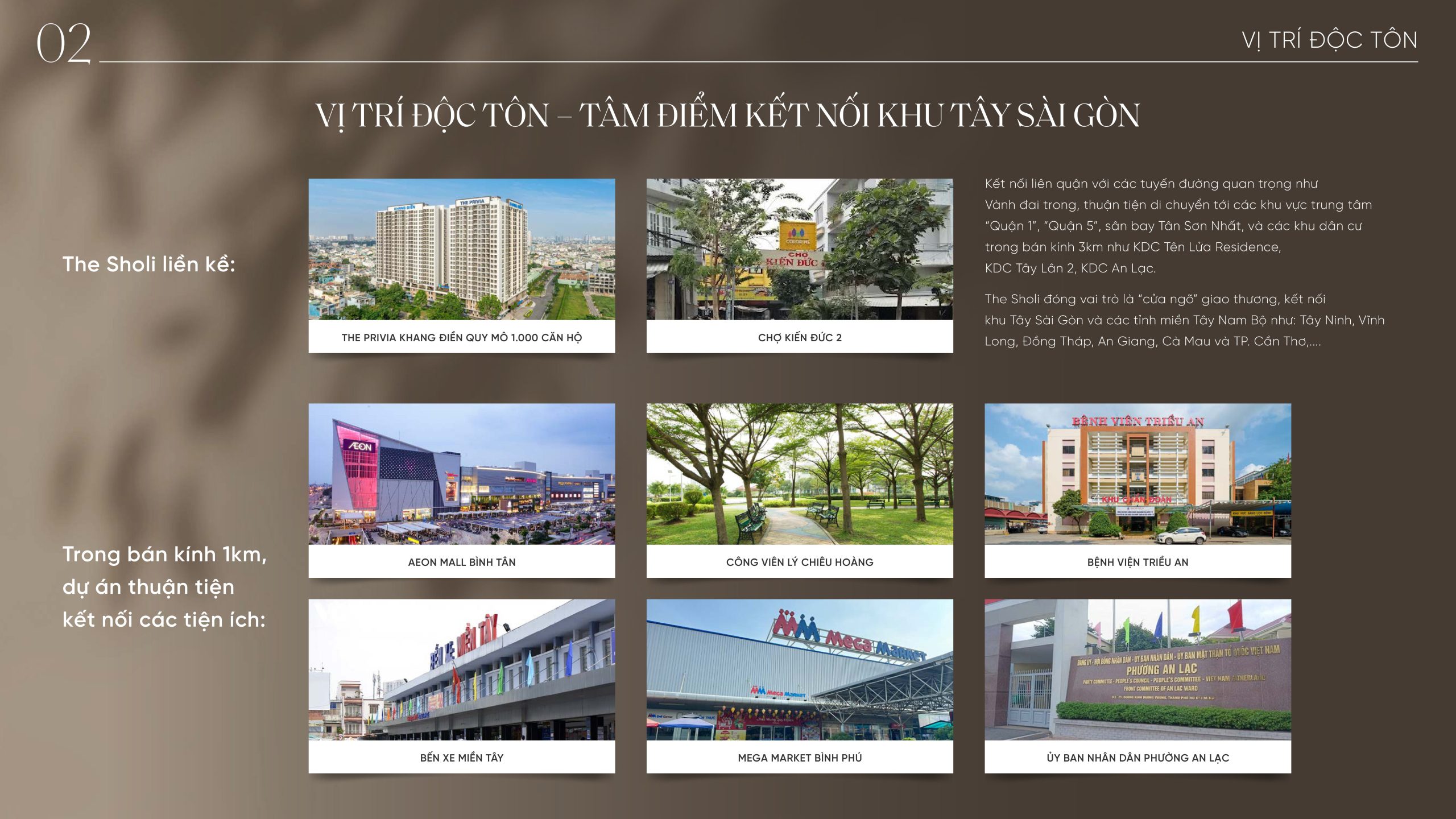 Dự án nhà phố thương mại The Sholi Bình Tân có vị trí đắc địa 4 mặt tiền đường, toạ lạc tại 311 An Dương Vương, An Lạc, Bình Tân, TP HCM liền kề 2 KDC sầm uất bậc nhất khu tây ( KDC Tên Lửa và KDC Bình Phú ) và AEON Mall Bình Tân, vị trí siêu kết nối mang trong mình sứ mệnh thay đổi và trở thành một biểu tượng mới, một tiêu chuẩn mới về Tổ Hợp Phố Thương Mại về Mua Sắm – Ẩm Thực – Giải Trí đẳng cấp đầu tiên tại khu Tây TP.HCM.